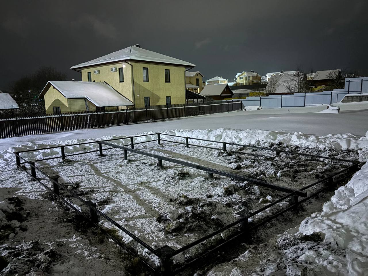 Процесс погружения винтовых свай проходил под строгим контролем уровня. Каждая свая завинчивалась на глубину ниже уровня промерзания почвы, что гарантирует стабильность фундамента в любое время года. После того как все опоры были установлены, мы произвели их обрезку по единому горизонтальному уровню и заполнили полости цементно песчаной смесью для предотвращения коррозии изнутри. Завершающим этапом монтажа стала приварка оголовков. Несмотря на то что рабочий день затянулся и финальные кадры были сделаны уже в сумерках, на качестве работы это никак не отразилось. На вечерних фото можно заметить легкую дымку и недостаток освещения, но даже в таких условиях видна четкая геометрия и аккуратность каждого сварного шва.