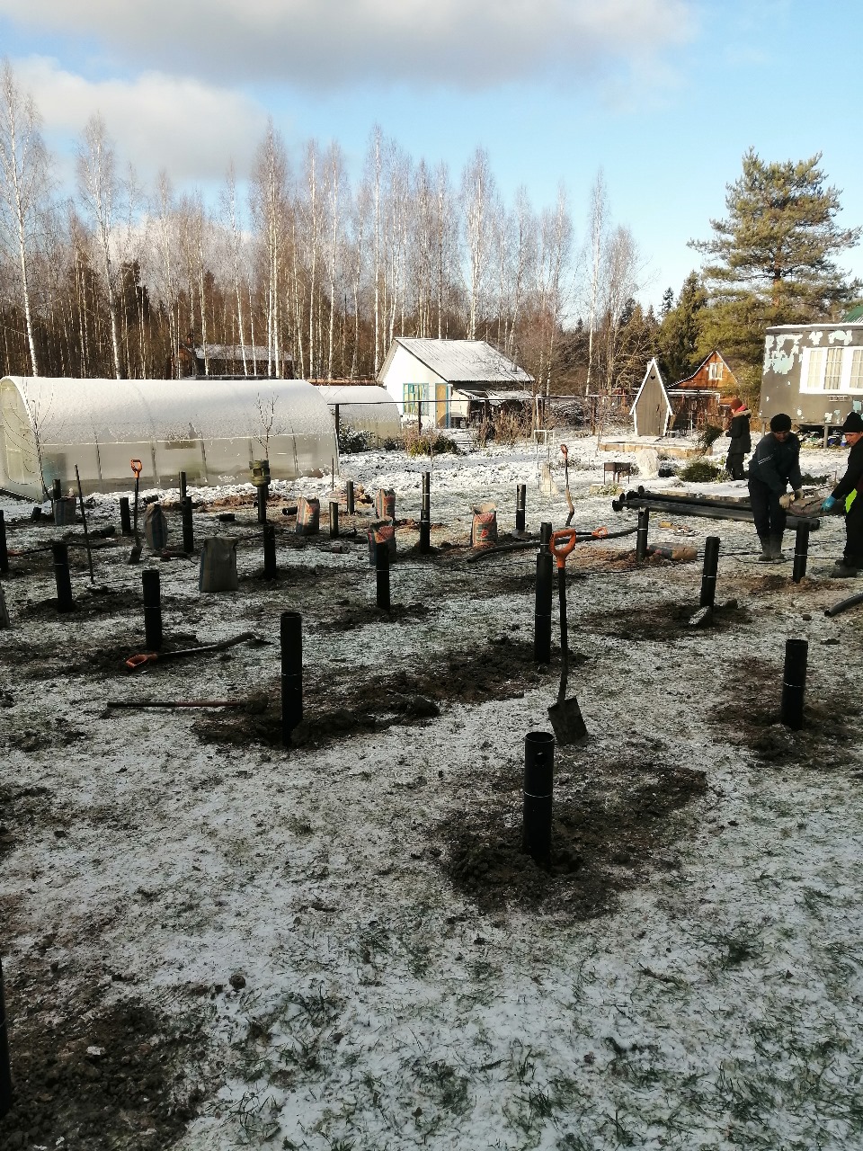 Фундамента на сваях в зимний период - 40 винтовых свай с укосинами и обвязкой швеллером